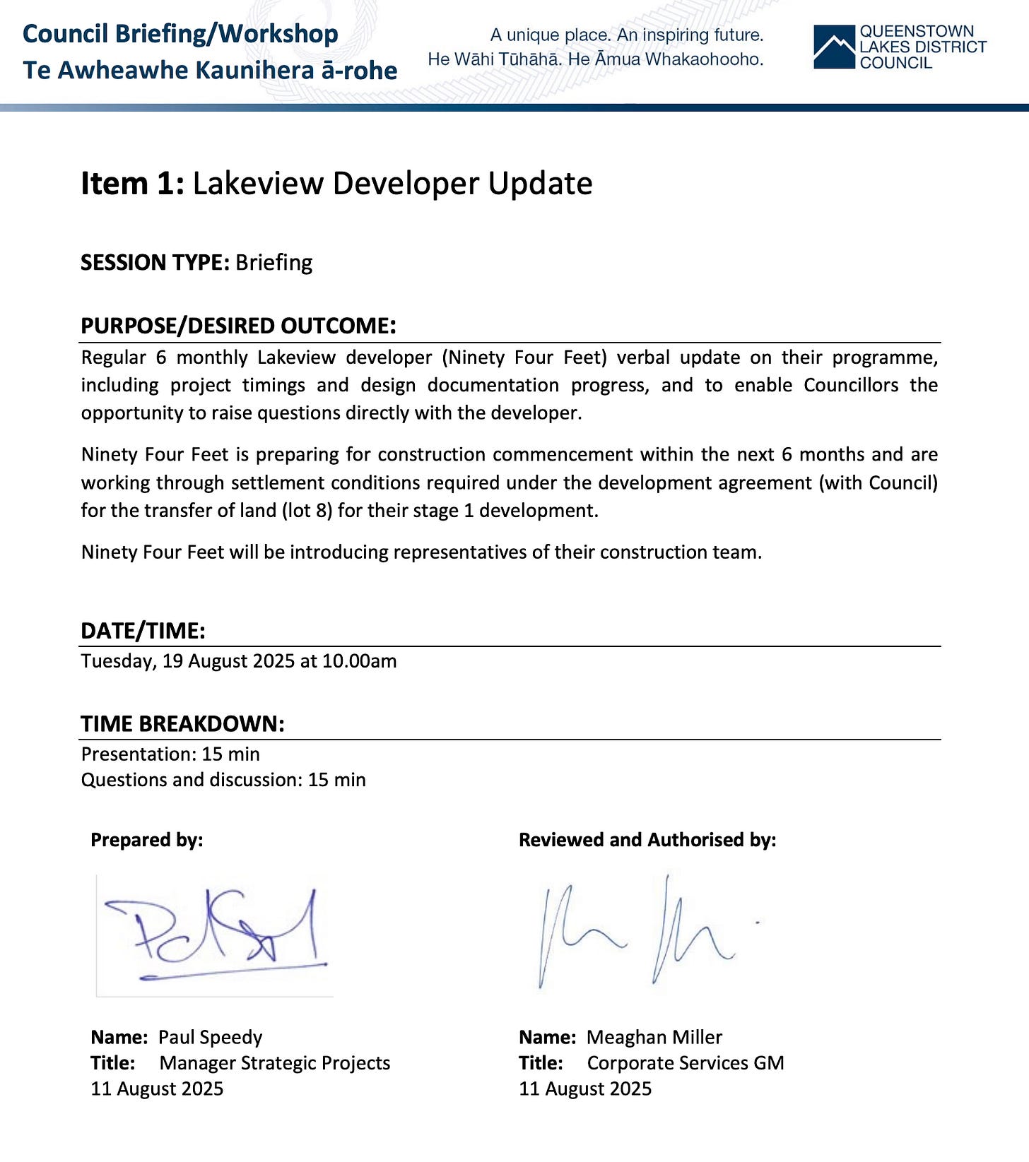 “Regular 6 monthly Lakeview developer (Ninety Four Feet) verbal update on their programme, including project timings and design documentation progress, and to enable Councillors the opportunity to raise questions directly with the developer.